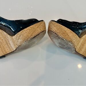 Gucci Patent Leather Platform Wedges in Black with buckled slingback, peep toe, and straw fabric heel. Worn and in good condition. Size 36.5. *See all photos for condition of scuffs/flaws, and wear on heels/soles.