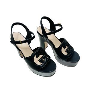Step into elevated sophistication with these Authentic Gucci Cutout Interlocking Platform Sandals, crafted in smooth black leather. Featuring the iconic interlocking G cutout design, high platform heel, and adjustable ankle strap, these sandals balance statement style with modern elegance.