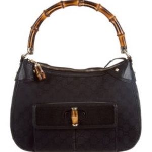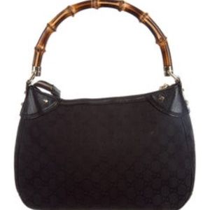 Black GG canvas Gucci Bamboo handle bag with gold-tone hardware, black leather trim, single rolled bamboo handle, single exterior pocket at front with turn-lock closure, black woven lining, single zip pocket at interior lining and zip closure at top. Includes dust bag