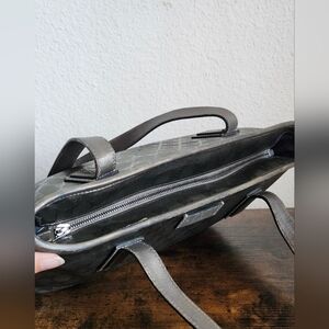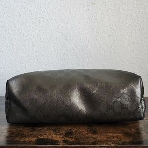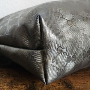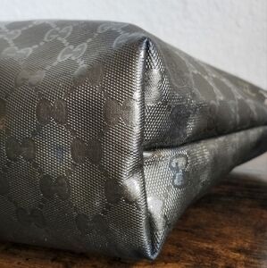 Metallic coated canvas with leather straps and trim. Exterior shows minor wear, some darkening at corners and wear on leather. Interior is clean. Measures 11x9x4"