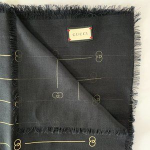 The Gucci GG Thin Striped Scarf in Midnight Blue is crafted of lightweight, Italian wool in a deep navy. This scarf features a delicate, thin gold line pattern with interlocking GG logos and eyelash fringed edges.