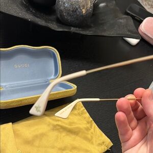 Elegant Gucci sunglasses with gold frames and brown lenses. Includes branded case and pouch.