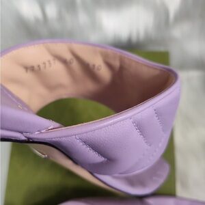 The GG Marmont line is continually reimagined for each new season. Presented in lilac, the softly padded chevron matelassé leather covers the entire insole as well as upper of the thong sandal, while the signature Double G decorates the front.