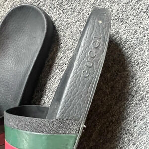 Gucci Red Green Stripe Slides, size 9, wear to sole, insole, and sides of shoe pictured. Please see all, wear throughout