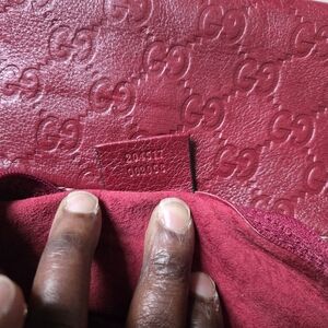 Stylish red leather wallet with embossed Gucci logo. Perfect for everyday use.