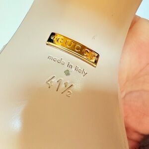 These Gucci mules feature a chic pink and gold color palette, highlighted by a signature gold-tone horsebit detail. The open back design and flat sole offer comfort and style, making them perfect for both casual and semi-formal occasions.