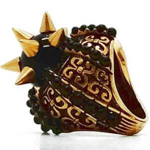 This is a Gucci ring with a spiked black orb and a gold filigree design band.