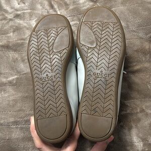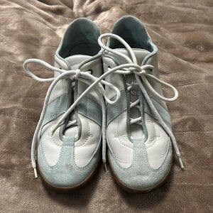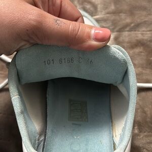 Vintage light blue leather and suede Gucci sneakers. These are from late 90’s-00’s. These are preloved, they do show some wear. They do have some creasing, but still a whole lotta life to live! These are size 36. I’m a 6 1/2 and usually wear a 37, but these fit perfectly with toe wiggle room.
