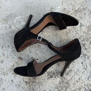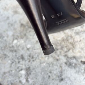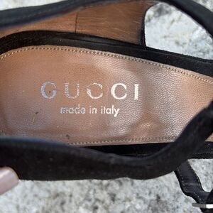 Check out the pictures these Gucci suede sandals are in very good condition except for one little scrape on the back of the heel . Heel height is 3.75 inches.