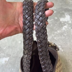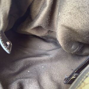 Please look at the pictures. This is a good bag, but it is not perfect, it needs cleanup and has some runs in the bottom. One of the horse bits on the back has tarnish and on the opposite side one of the studs was replaced. It’s not a perfect match, but it’s not noticeable. Please look at the bag being sold as is. Measuring across the bottom leather strap to leather strap is 14 inches measuring across the top is 16 inchesx 11” x 4.5, handle drop is 8.5. Measurements are approximate