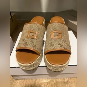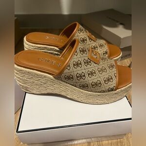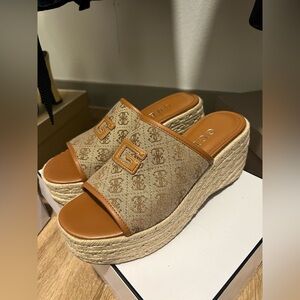 Chic Guess wedges with logo design. Beige fabric and woven platform. Ideal for summer wear.