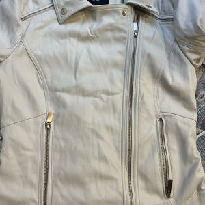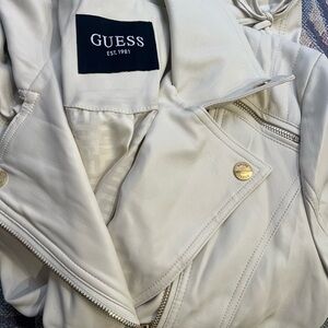 This Guess leather jacket in a sophisticated cream hue features a classic motorcycle style with an asymmetrical front zipper and a wide lapel collar. Crafted for a fitted silhouette, it offers a sleek and modern look perfect for elevating any outfit.size Small
