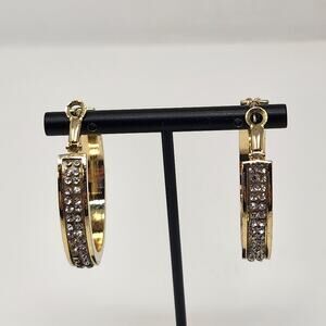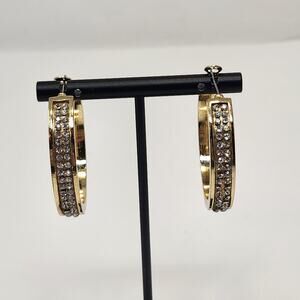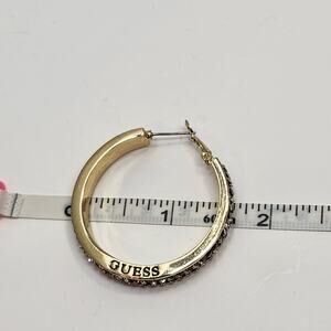 Guess Gold Tone Clear Crystal Pave Large Hoop Earrings Logo Chunky Statement