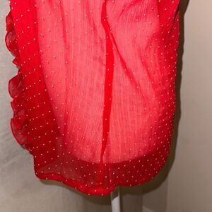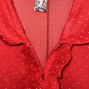 Guess L Red Textured Polka Dot Romantic Sheer Short Sleeve Collared Blouse