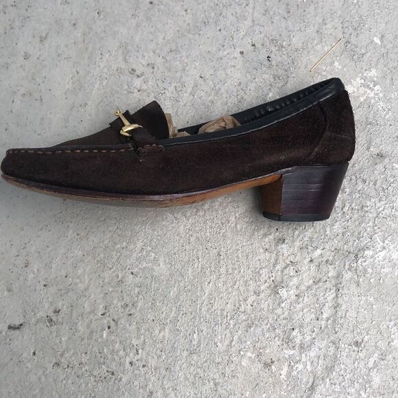 Really nice vintage shoes made in Argentina, saddle bit buckles are perfect. Could probably used to be resoled as you see in one picture. It was about an inch and a half. Priced accordingly, Brown suede leather interior