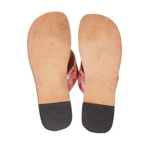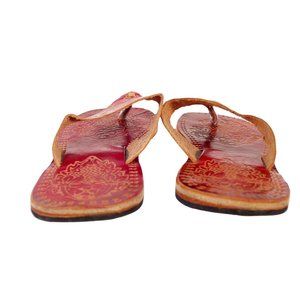 Beautiful Boho leather thong sandals in a deep reddish raspberry pink. Pretty tooled pattern has the vibe of traditional henna designs applied to Indian brides' feet. Leather soles. Synthetic heels.