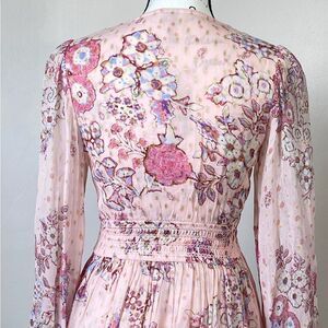 From Hemant & Nandita, this floral print minidress features fabric-covered buttons, sheer blouson sleeves, and a gathered underbust band around the waist. Metallic dots and scalloped lace trim finish the look.