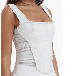 Gathered sheer mesh insets detail the sides of this sculptural corset top that's contrasted with romantic eyelet fabric at both the front and back.