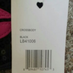 NWT Betsey Johnson "Luv Betsey " crossbody bag. Cheeky graphics in hot pink as well as black sequins adorn this adorable bag. Bag is 7.5 inches in diameter. Gold chain and black shoulder strap.