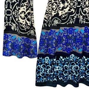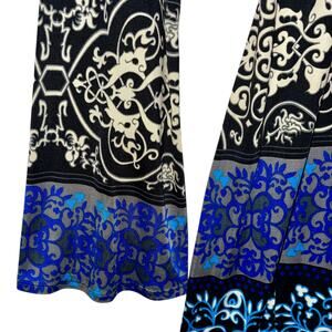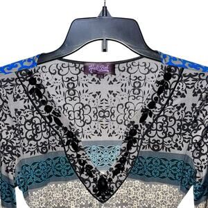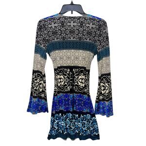 Stunning Hale Bob dress in size XS! This dress features a luxurious velvet burnout design on silk fabric with elegant bell sleeves. The gemstone V-cut neckline adds a touch of sophistication, while the unique scroll pattern gives it an eclectic flair. Perfect for special occasions or a night out!