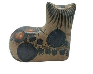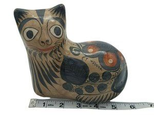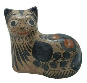 Hand Painted Folk Art Pottery Resting Cat Signed Mexico Flower and Leaves