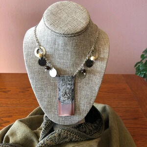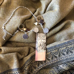 Beautiful handmade one of a kind copper stamped necklace .  Unique stamped swirl design with crystal accents. Metal and bead accents on the chain. 17” drop with 2” extender.