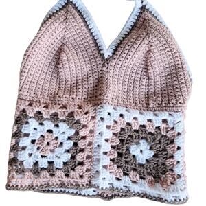 In very good condition handmade crop chunky knit halter top pastel pink brown white granny square afghan like design .see measurements fits like a medium