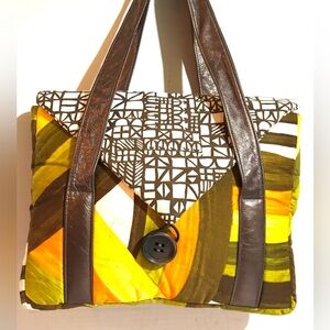 Handmade Stylish and vibrant, this multicolor geometric patterned bag with leather straps & trim is perfect for any occasion. Featuring a unique design with brown accents, it adds a touch of elegance to your outfit. Main compartment 2 pockets at interior wall 1 zip closure hight 10” wide 14” depth 1.5” strap drop 10”The dimensions are based on approximately measurements before placing an order please check take a moment to view all photos using feature for a closer look