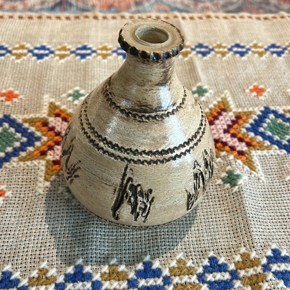 Unique handmade pottery vase featuring a neutral beige glaze with hand-painted black tribal/zig-zag designs. This studio art pottery piece has a rustic, earthy charm and is signed on the bottom with a maker’s mark (see photos). Perfect for boho, farmhouse, or eclectic décor.