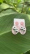 Charming handmade polymer clay pastel pink dangle earrings with white floral design. Perfect for adding a touch of elegance.