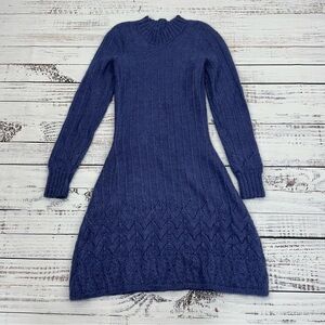 Handmade Unbranded Women’s size Small Blue Alpaca Knit Long Sleeve Dress in good preowned condition no pilling. No tags on dress at all and it feels like Alpaca but it could be a blend. Fits like a size small measurements are in the photos. Material is stretchy also a light knit not think may need to wear something under it.