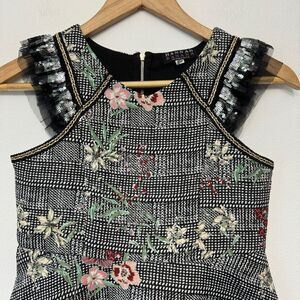 Dress is lined and has a floral pattern with sequin and tulle around the sleeves.