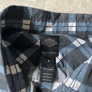 Harley Davidson Shirt Mens Large Gray Plaid Logo Button Up Biker Motorcycle in gently used condition. Size men’s large. Pit to pit 21”, total length 28”.