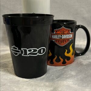 This set of Harley Davidson drinkware features a design highlighting the "Ride into a New Era" theme for the 2024 Street Glide and Road Glide models within the Grand American Touring line. Included in the set are 2 16 oz plastic cups, a 20 oz recycled aluminum water bottle, a Harley Davidson branded mug with flames, and a koozie.