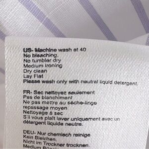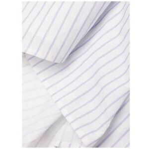 Off the shoulder top. 3/4 sleeves. Ties at the back neckline. lavender stripes on white background.
