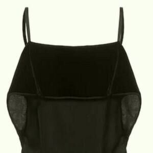 cami, velvet, no appliqués, basic solid color, deep neckline, sleeveless, no pockets, side closure, zipper closure, small sized Length 13.26 inchesMinimalist, simple, modern, neutral, capsule, timeless, classy, chic, cocktail party occasion event holiday glam nye exaggerated ruffle black off the shoulder