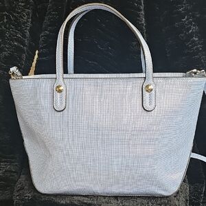 This sophisticated tote from Henri Bendel showcases a stunning blue and gold color palette, enhanced by elegant floral embellishments. Crafted with a structured design and gold-toned hardware. Comes with story tag and crossbody strap. Dead Stock, this line is no longer made, a definite collector's piece!💜