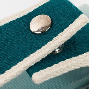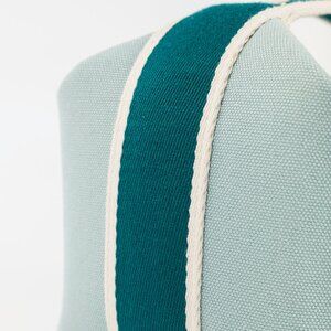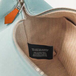 Made in France, this small Bride-a-Brac case from Hermes is crafted with a sturdy canvas in a light Eucalyptus blue, and features silver-tone hardware, a teal polycotton strap with snap closures and white edges, an embroidered "H" motif on the front, a top zip closure with a leather pull, and a herringbone canvas-lined interior containing three slip pockets.
