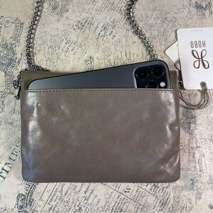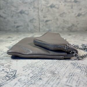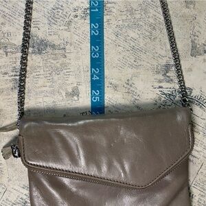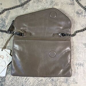 A removable chain shoulder strap with convertible wrist strap adds convenience in a variety of styling with a streamlined crossbody clutch created from worn out leather with vintage appeal.