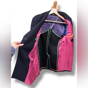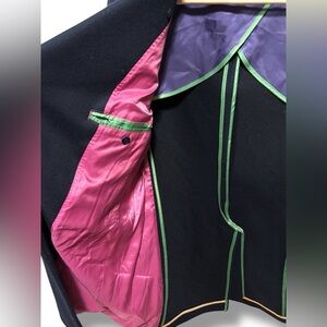Elegant black jacket with a colorful interior. Features pink, purple, and green lining. Perfect for adding a pop of color. Warm and elegant, perfect for day or night.