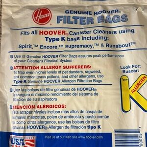 RARE Hoover Type K Package 4010028K Fits all Hoover Canister Cleaners Inc- Spirit, Encore, Supremacy, & Runabout ( Allergen Filter Bags - package of 3 )