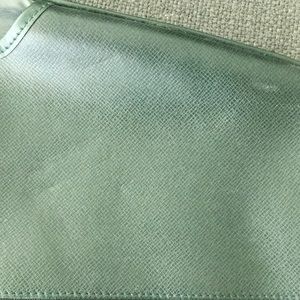 Louis Vuitton authentic dark green Taiga leather garment bag. Gently used. Has one hanger for a dress or suit. Brass parts need cleaning (including hangar) and zippers don't run smoothly but can be fixed😊 has white marks on leather as shown. Marks on inside linner. Some rubbing, scratches and creases throughout and sides. Handle has scuffs. Beautiful piece for travel❤️. For more pics please lmk! Thanks!