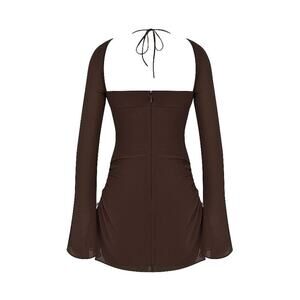 dress, mini dress, halter, chiffon, cutout, chocolate, brown women, stretch, tight, mesh, soft, lined, cocktail, party, comfy, dinner, dates, flared, cutout, halter neck, underwired, lightweight, designer, summer, spring, fall, solid. B80523.