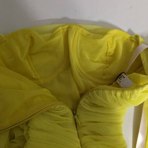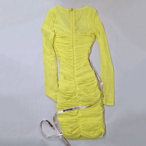 Vibrant yellow mini dress. Long sleeves. Square neckline. Perfect for a bold look.