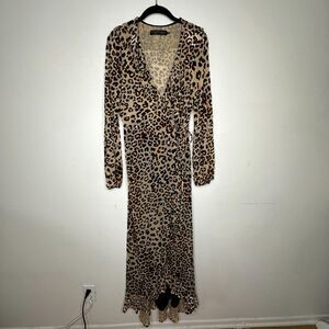 House of Harlow 1960 Cheetah Print Lafayette Wrap Front Tie Maxi Dress Ruffle L