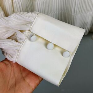 House of Harlow x Revolve Piper Blouse in Ivory. This beautiful long sleeve sheer top features a v neck with elaborate ruffles and pleating, flounce overlay voluminous balloon sleeves with cuffs and buttons, and a beautiful chiffon fabric with mini pleats and added texture. Women's size L large, measurements pictured. Excellent condition. Rare, hard to find House of Harlow 1960 x Revolve piece.