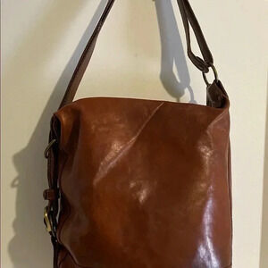 Authentic I Medici distressed brown leather shoulder handbag with brass hardware main compartment 1 zip pocket closure & zip closure at top jacquard fabric lining logo at front & hardware exterior have creasing marks please check all photos hight 13.75” width 12” depth 7” Strap drop 13” adjustable Bag dimensions are based on approximate measurements.