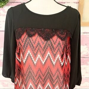 I.N STUDIO Women’s Red Black White 3/4 Sleeve Chevron Print Lace Blouse in a size Small