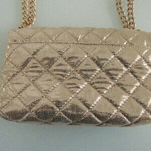 Description: Up for sale is an International Concepts INC women's small gold metallic shoulder bag/purse. This handbag has a gold quilted pebble grain finish. It has a double handle gold chain shoulder strap designed to be worn long(single) or short (double). It features a polished gold secure flap closure. The interior features 2 zipper closure compartments and 2 small interior pockets. The bag dimensions are approximately 8" wide x 6" high x 4.50" depth. This handbag is in excellent condition.
