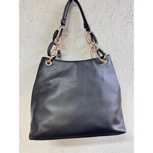 This bag features black faux-leather with chain link and leather handles. Lots of pockets and compartments to help you stay organized. Large tote style.